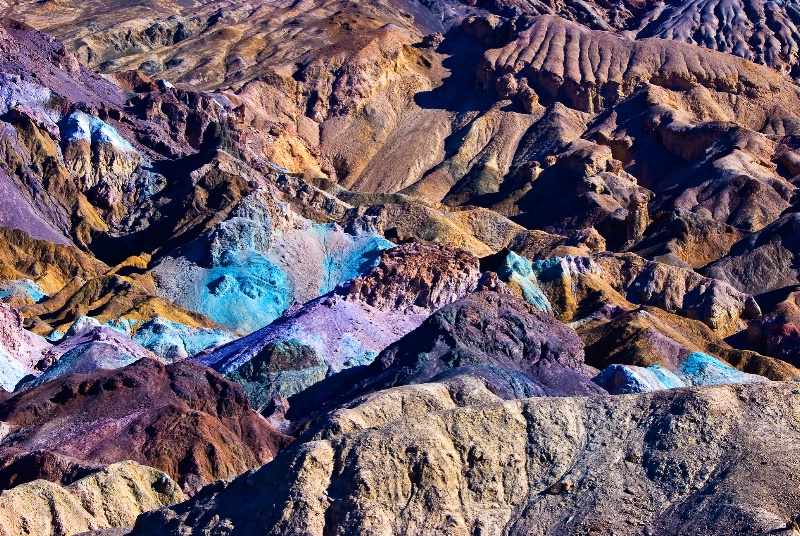 W centrum Doliny Śmierci usytuowana jest grupa skał o niezwykłych barwach zwana Artists Palette. Powstały one w wyniku zachodzącej w skałach reakcji utleniania związków chemicznych. Barwa czerwona, fioletowa i żółta powstają w wyniku utleniania związków żelaza; barwa zielona powstaje w wyniku rozkładu miki. Innymi ciekawymi formami skalnymi są, pokrywające olbrzymi fragment dna doliny, kilkunastocentymetrowe bryły (stanowiące mieszankę ziemi i soli) zwane Devil’s Golf Course (Pole golfowe diabła). Bryły w kształcie stożków są niezwykle twarde i posiadają ostre krawędzie