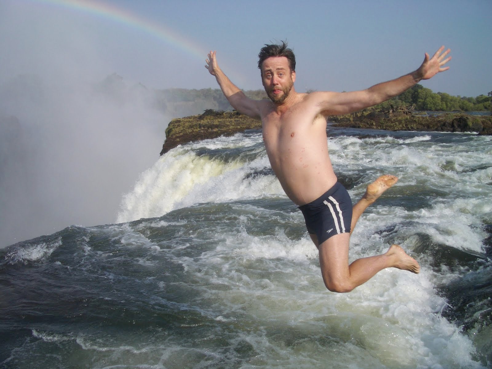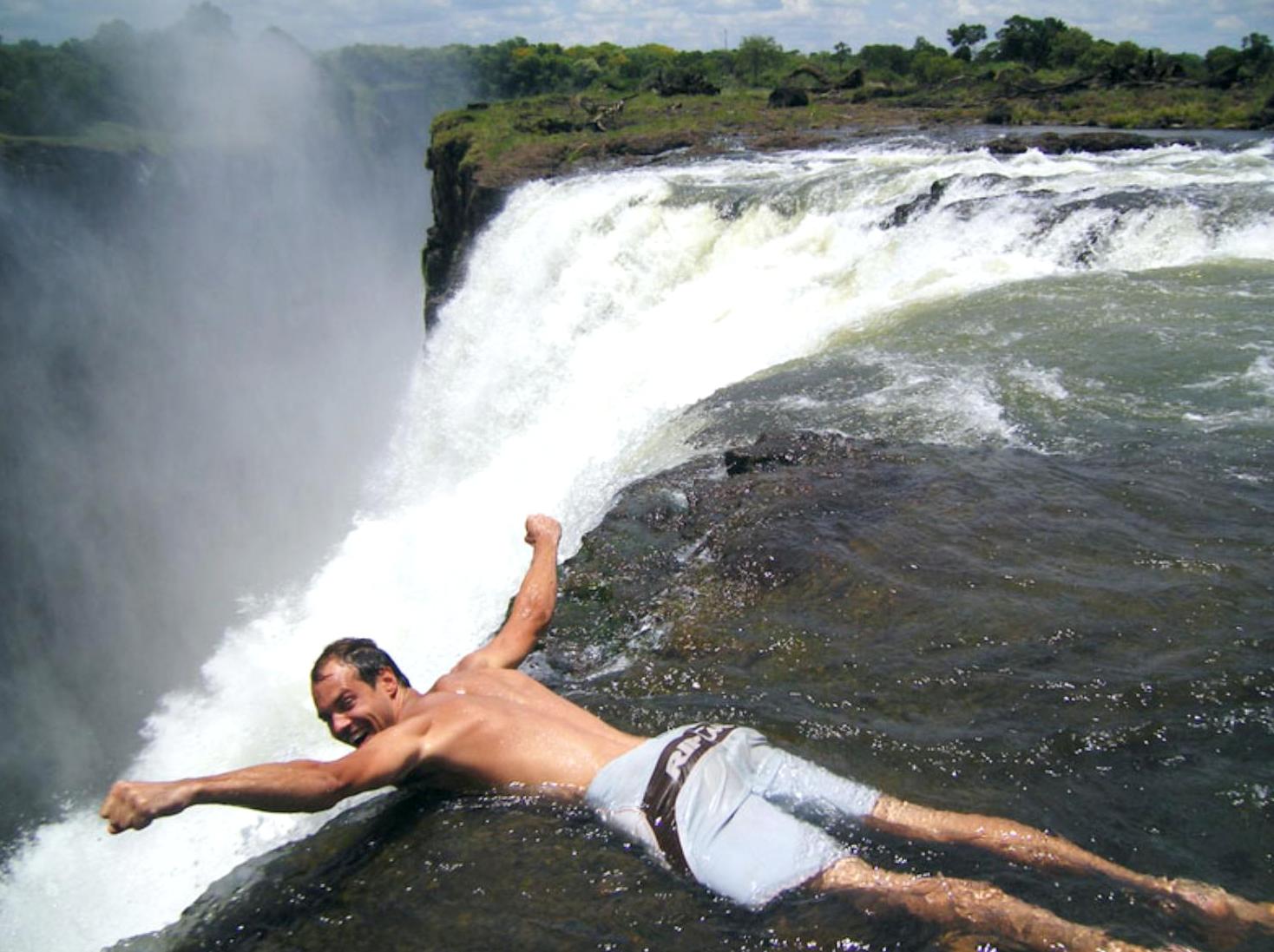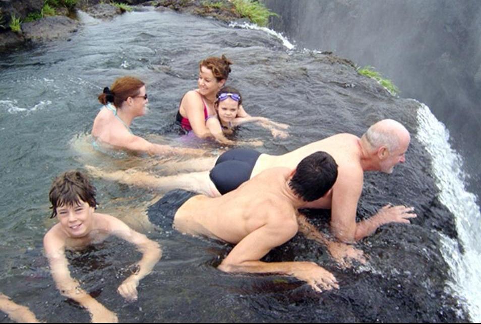 Atrakcją tego miejsca przeznaczoną dla prawdziwych twardzieli 🙂 jest kąpiel na szczycie Wodospadu Wiktorii w położonym na skraju 110 metrowej przepaści „basenie”. Już sama droga do Devil’s Swimming Pool jest niebezpieczna. Wędrówka, która może trwać nawet trzy godziny, polega na przeskakiwaniu ze skały na skałę, pokonywaniu śliskich powierzchni i omijaniu wartkich nurtów, które nieuważnych mogą strącić poza krawędź wodospadu. Wodospad Wiktorii ciągnie się przez niemal dwa kilometry, na granicy Zambii i Zimbabwe. Za 5 dolarów przewodnicy od strony zambijskiej prowadzą śmiałków do basenu i obszaru na szczycie wodospadu, który znany jest pod nazwą Wyspy Livingstone.